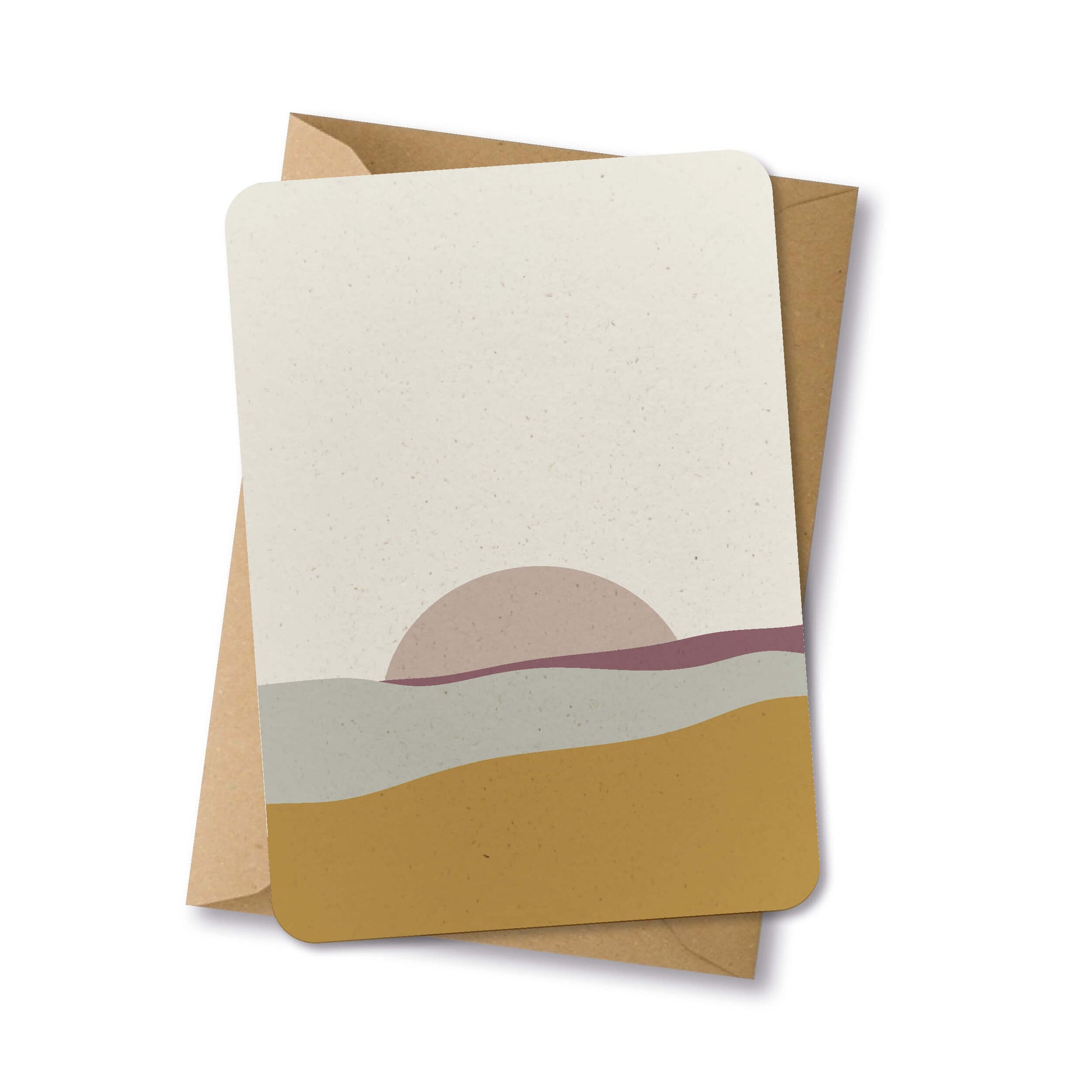 Deze ansichtkaart is gedrukt op ecologisch papier, met design van een abstracte ondergaande zon. De ronde hoeken geven de kaart een exclusieve uitstraling. De achterkant is blanco, perfect om een persoonlijke boodschap te schrijven. Inclusief een gerecycled kraft papier envelop.