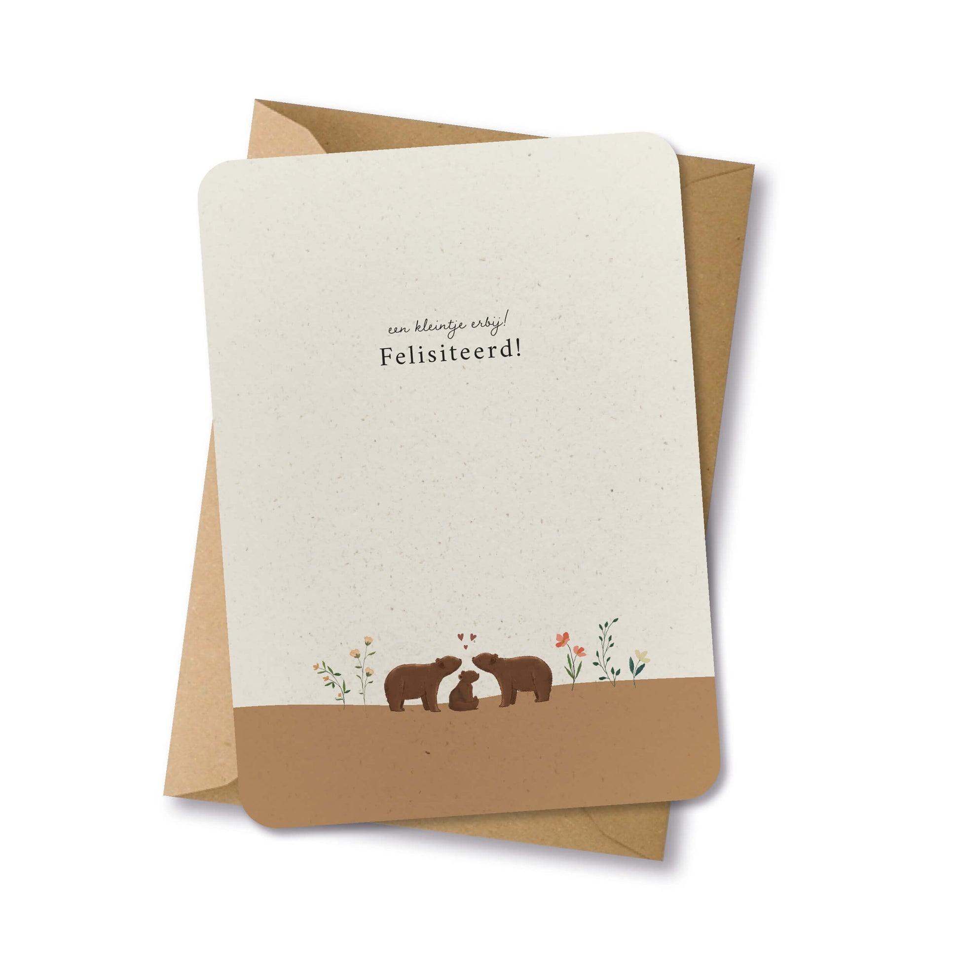 Deze ansichtkaart is gedrukt op ecologisch papier, met de tekst 'een kleintje erbij, felisiteerd' en een berenfamilie. De ronde hoeken geven de kaart een exclusieve uitstraling. De achterkant is blanco, perfect om een persoonlijke boodschap te schrijven. Inclusief een gerecycled kraft papier envelop.