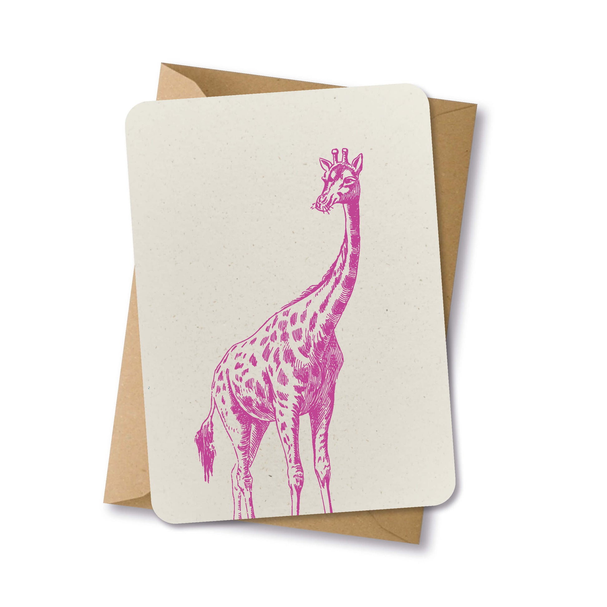 Deze ansichtkaart is gedrukt op ecologisch papier, met een grote getekende roze giraf. De ronde hoeken geven de kaart een exclusieve uitstraling. De achterkant is blanco, perfect om een persoonlijke boodschap te schrijven. Inclusief een gerecycled kraft papier envelop.