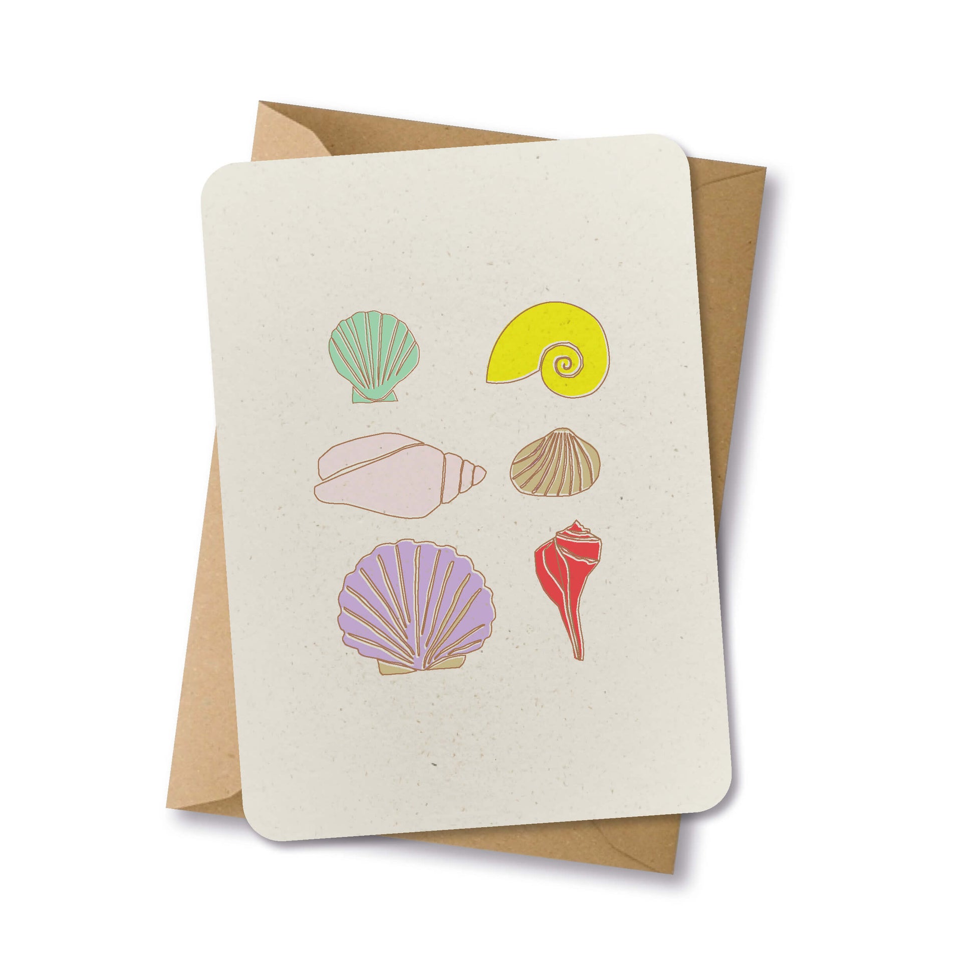 Deze ansichtkaart is gedrukt op ecologisch papier, met zes getekende schelpen in verschillende kleuren. De ronde hoeken geven de kaart een exclusieve uitstraling. De achterkant is blanco, perfect om een persoonlijke boodschap te schrijven. Inclusief een gerecycled kraft papier envelop.