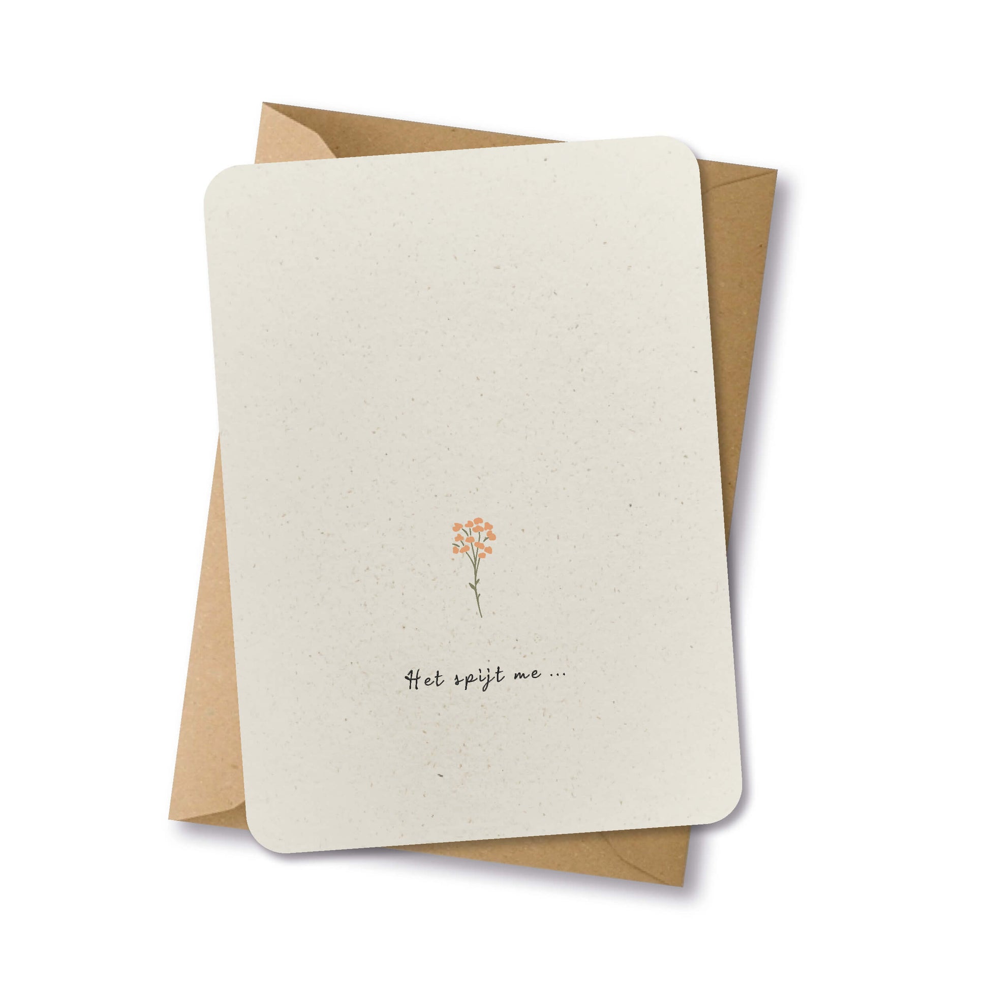 Deze ansichtkaart is gedrukt op ecologisch papier, met de tekst 'Het spijt me.....' en een klein oranje bloemetje. De ronde hoeken geven de kaart een exclusieve uitstraling. De achterkant is blanco, perfect om een persoonlijke boodschap te schrijven. Inclusief een gerecycled kraft papier envelop.
