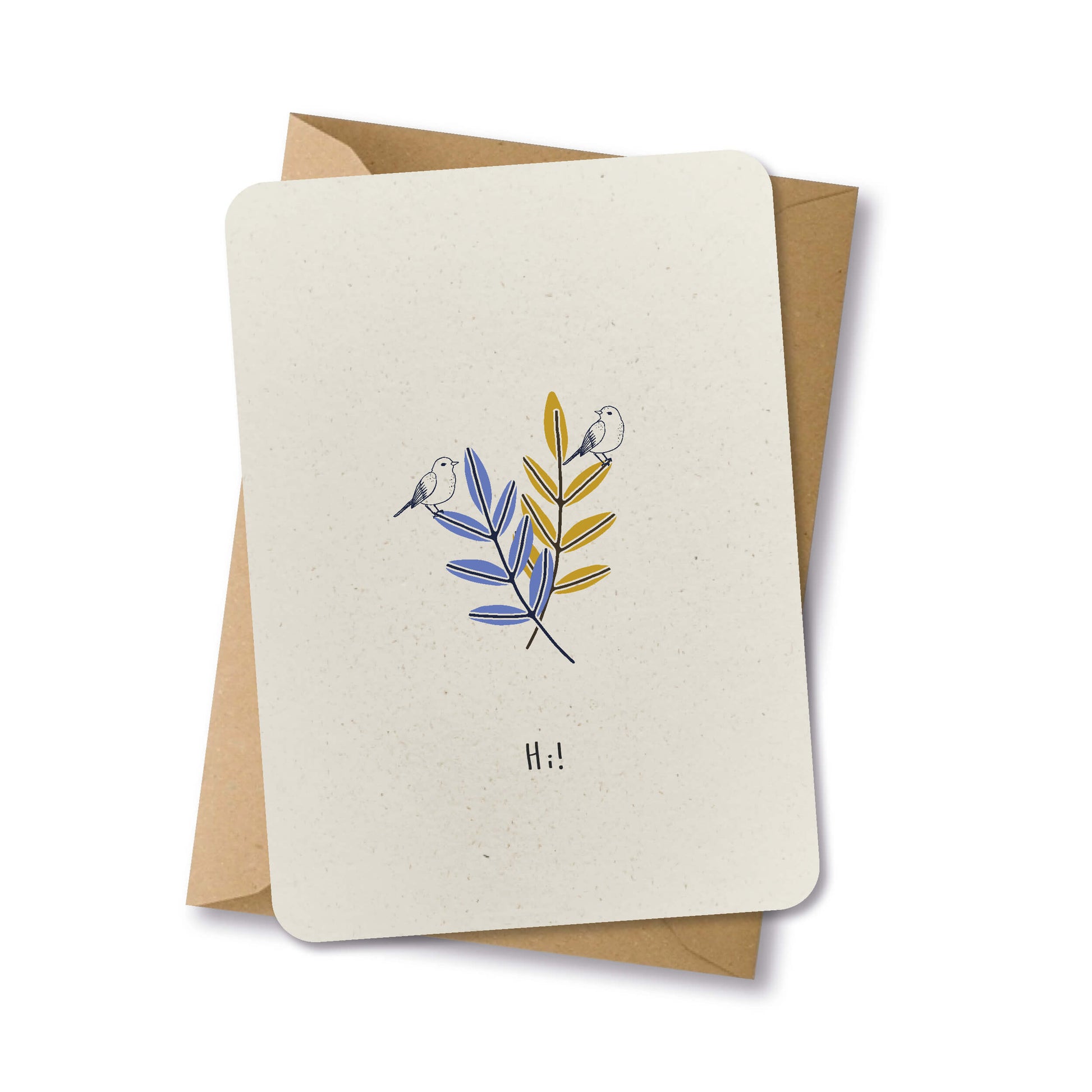 Deze ansichtkaart is gedrukt op ecologisch papier, met de tekst 'Hi' en twee vogeltjes op twee takken. De ronde hoeken geven de kaart een exclusieve uitstraling. De achterkant is blanco, perfect om een persoonlijke boodschap te schrijven. Inclusief een gerecycled kraft papier envelop.