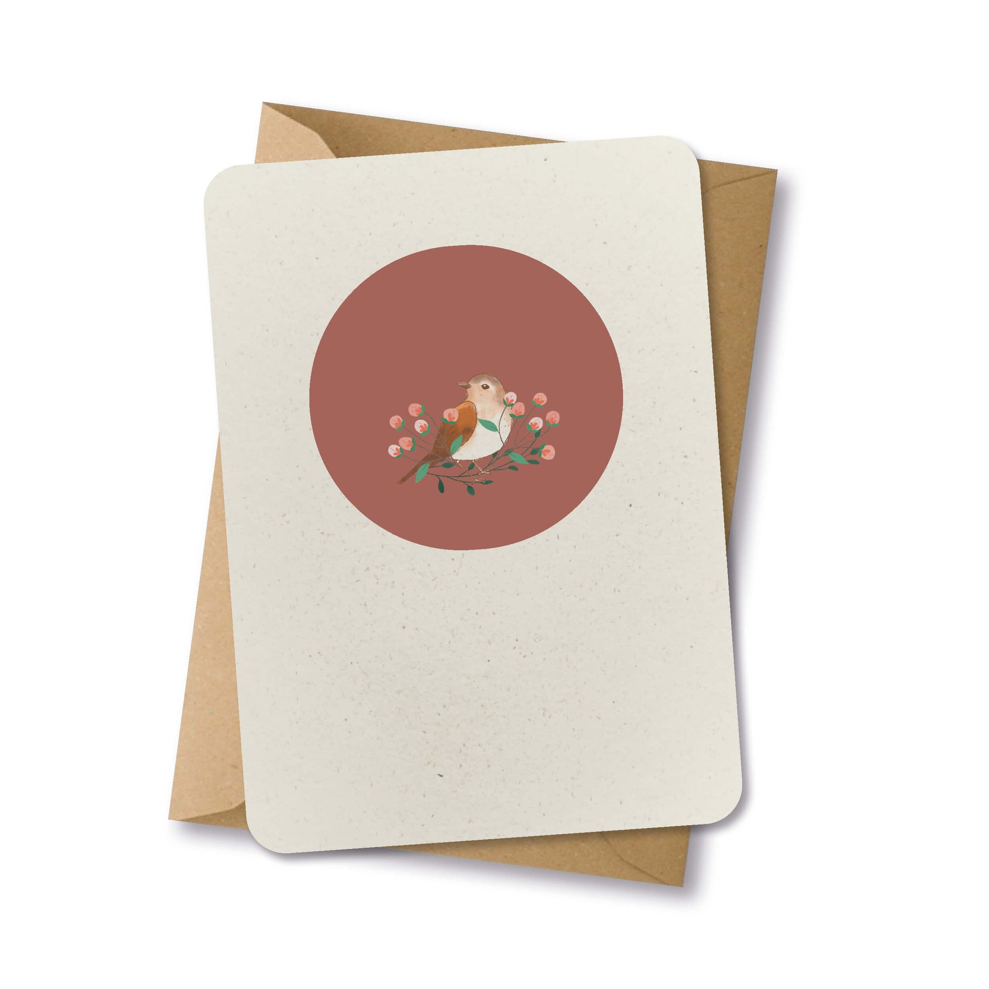 Deze ansichtkaart is gedrukt op ecologisch papier, met een roodborstje op een tak met bloemen. De ronde hoeken geven de kaart een exclusieve uitstraling. De achterkant is blanco, perfect om een persoonlijke boodschap te schrijven. Inclusief een gerecycled kraft papier envelop.