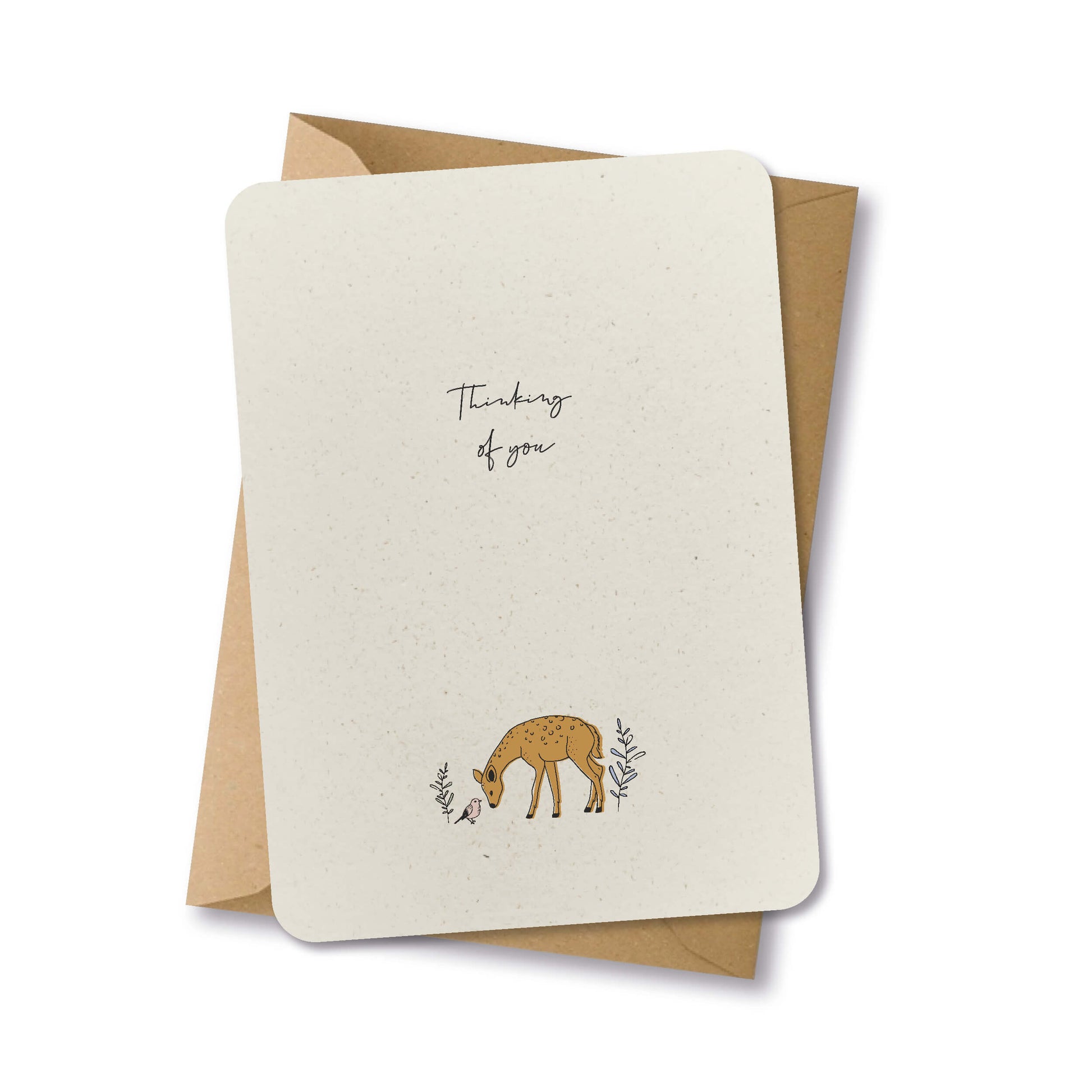 Deze ansichtkaart is gedrukt op ecologisch papier, met de tekst 'Thinking of you' in zwarte letters met afbeelding van een schattig hertje en een vogeltje. De ronde hoeken geven de kaart een exclusieve uitstraling. De achterkant is blanco, perfect om een persoonlijke boodschap te schrijven. Inclusief een gerecycled kraft papier envelop.